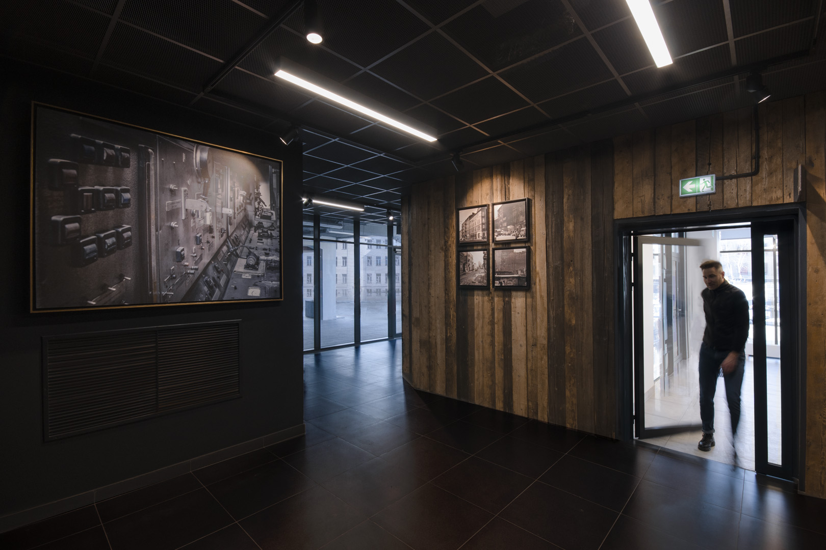 The design of reception and common halls refers directly to those days. Dark, illuminated only by spotlights spaces unveil